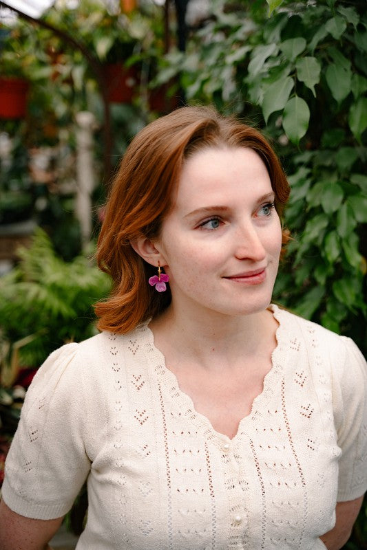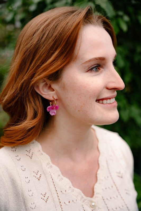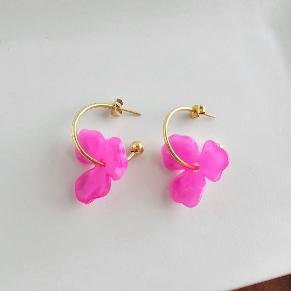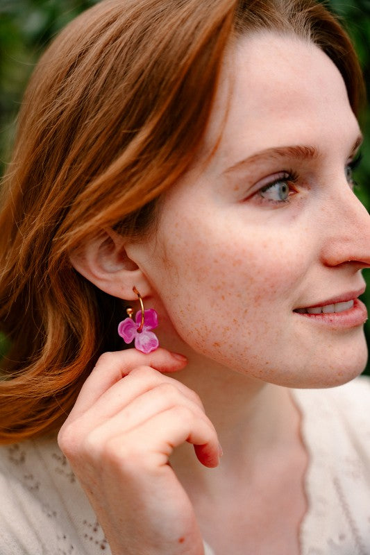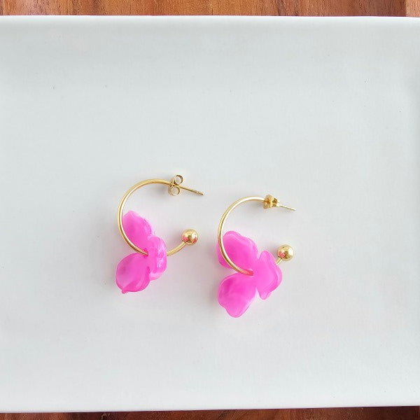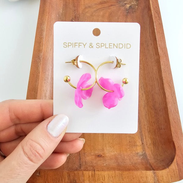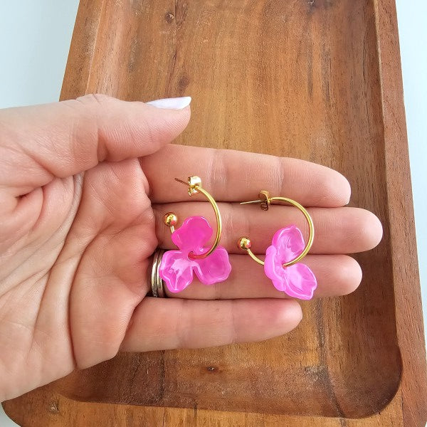 Add a fun twist to your hoop collection with our Magnolia Hoops in Hibiscus pink! Featuring sleek gold hoops adorned with stunning resin flowers, these earrings bring a bold pop of color to any look. Perfect for turning heads and leveling up your style, they're the ultimate accessory to stand out from the crowd.