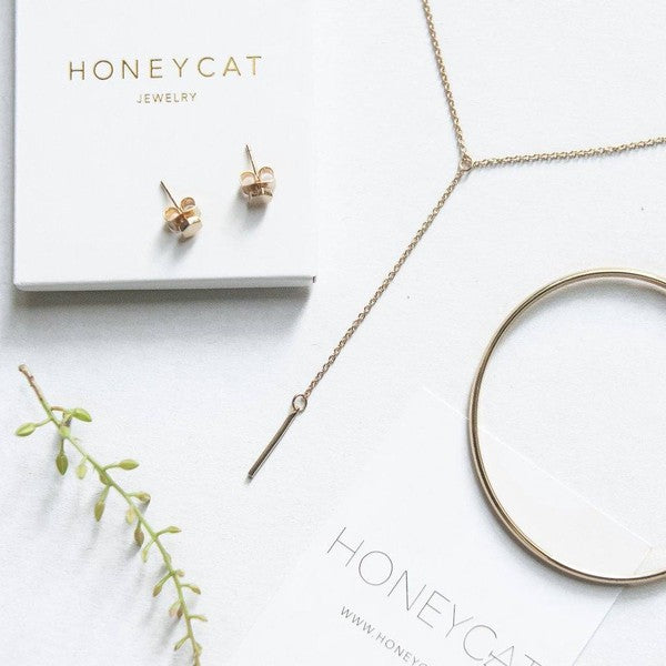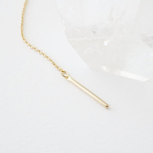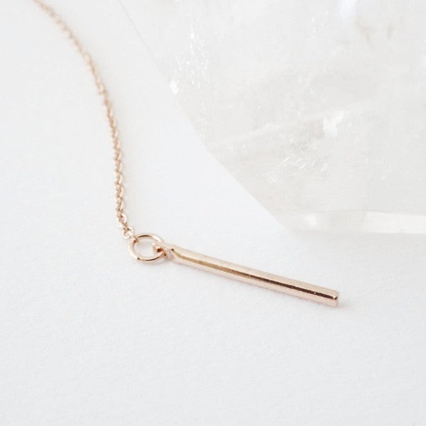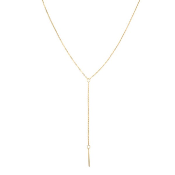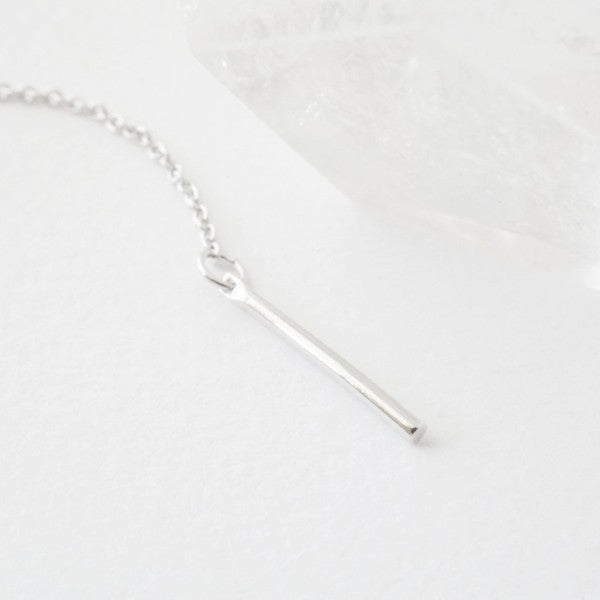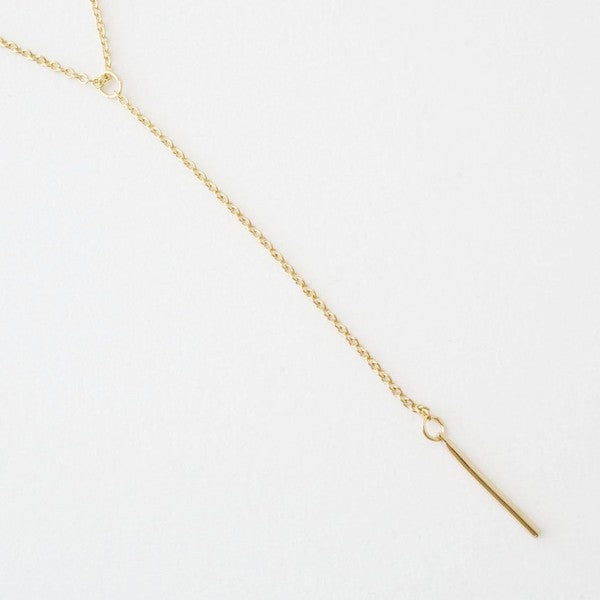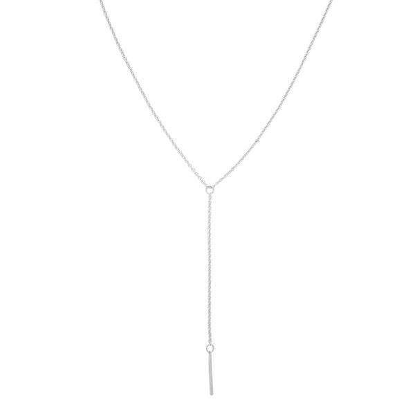 A whisper thin chained lariat necklace has a delicate drop detailed with a petite vertical bar with a smooth, shiny finish on a thin chain.