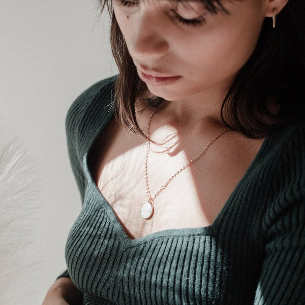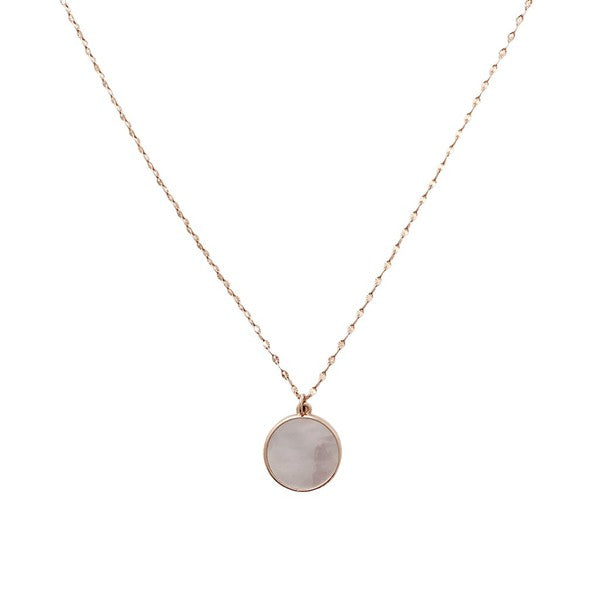 Kind of how Taylor Swift pulls off a classic red lip so well, this pendant stays modern while flaunting a romantic, pearlescent pendant. The pendant is draped on a twisted, tinsel like chain for the perfect amount of shimmer. Pendant features a gorgeous, iridescent mother of pearl face. Adjustable between 21" - 24". Pendant: 16mm high.