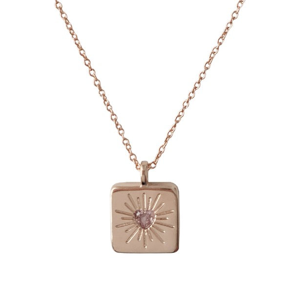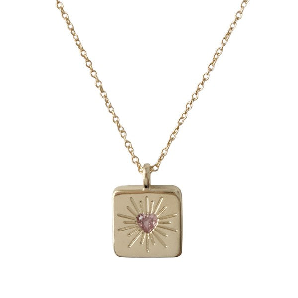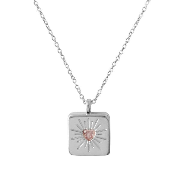 A pendant featuring a tiny, radiating pink crystal heart. The length is layering friendly with an adjustable length between 18" - 21". Measures 10mm.