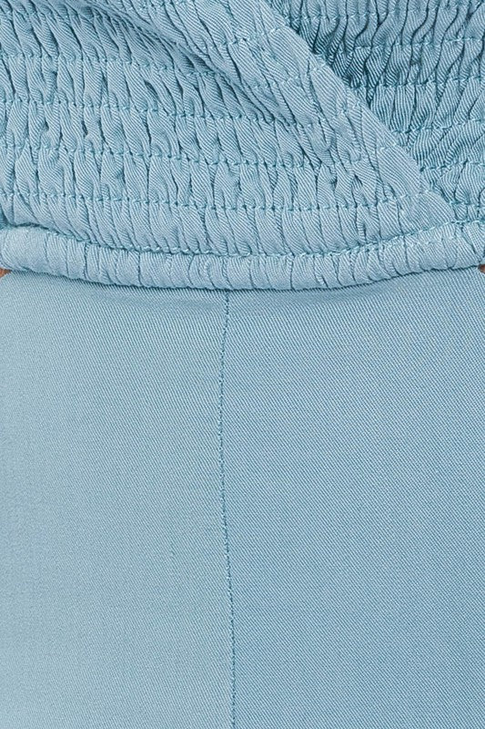 Introducing our Cut Out Back Tie Spaghetti Romper with zipper closure and smocked detail, a trendy and versatile addition to your wardrobe. This romper features a chic cutout back with a tie detail that adds a touch of allure and allows for a customizable fit. The spaghetti straps add a delicate and fashionable touch to your look. The smocked detail ensures a comfortable and flattering fit while adding texture to the outfit.