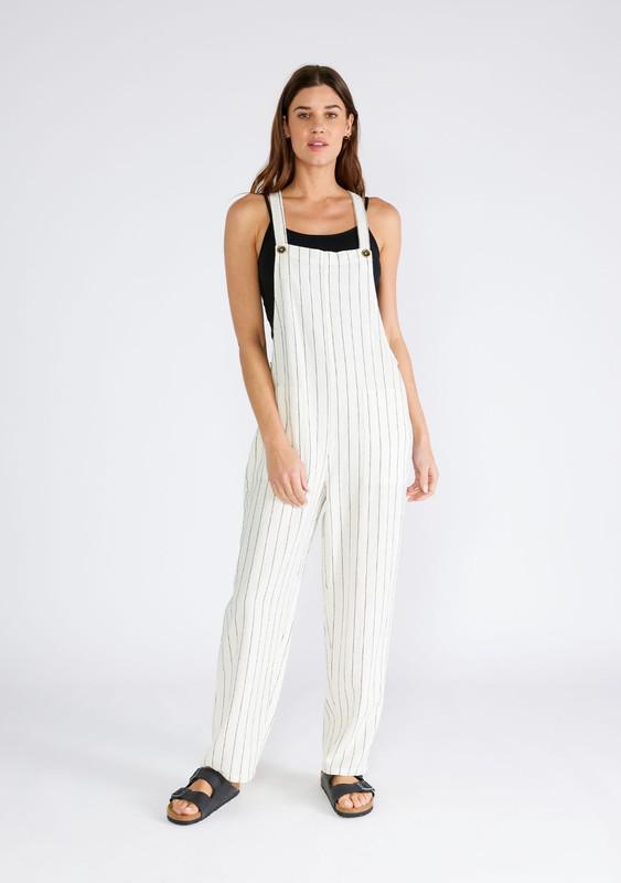 Linen blend overall in a yarn dye stripe. Features a straight leg, button strap, and side pockets. A versatile jumpsuit perfect for the