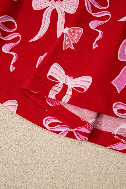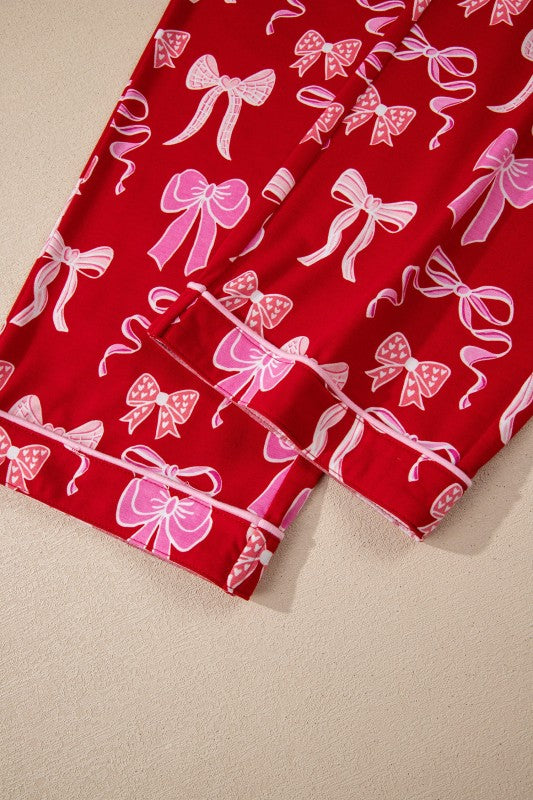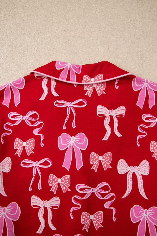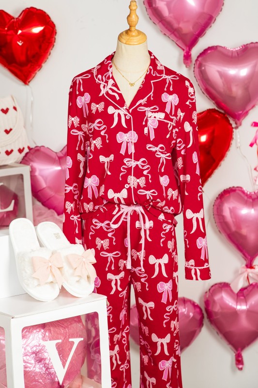 Slip into sweetness with this adorable pajama set featuring a charming bow design that brings playful femininity to your sleep routine. The relaxed shirt-style top pairs perfectly with soft, cozy bottoms that hug you in all the right ways, ideal for restful nights, Valentine's celebrations, or those blissful lazy days when comfort is all that matters. Crafted for all-night ease and lounging bliss, this set wraps you in warmth without sacrificing style. Polyester/Spandex