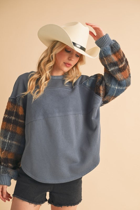 Cozy up in this unique Malva sweatshirt with soft, plaid-accented sleeves, blending comfort and style effortlessly. Paired with a rich brown corduroy mini skirt, it's the perfect balance of warmth and flair for those cooler days.