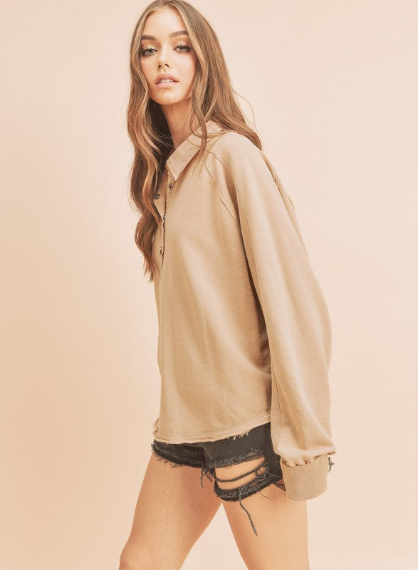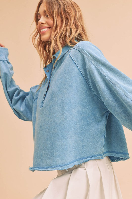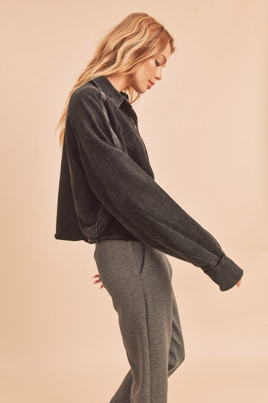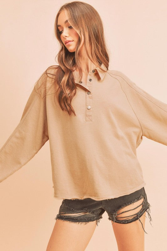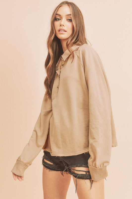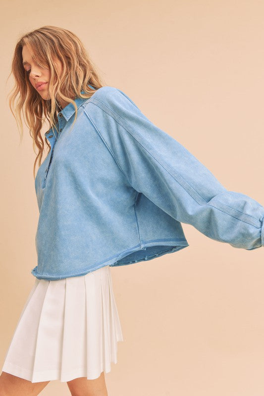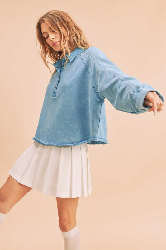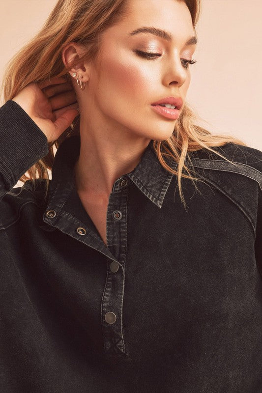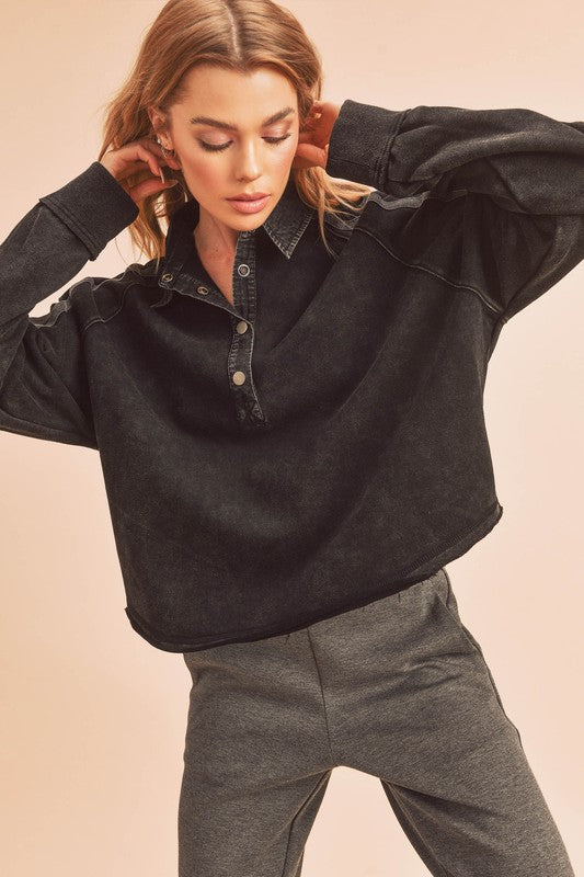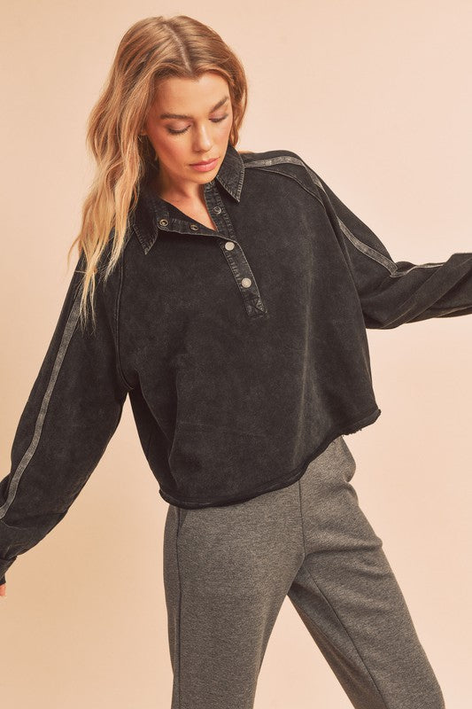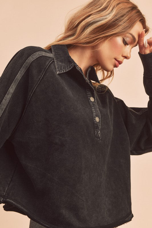 Sidney is the ultimate sporty pullover is featured in a cropped design with contrasting stripe on sleeve and collared, snap button collared neckline and slouchy raglan sleeves.