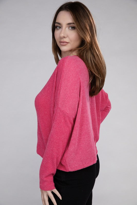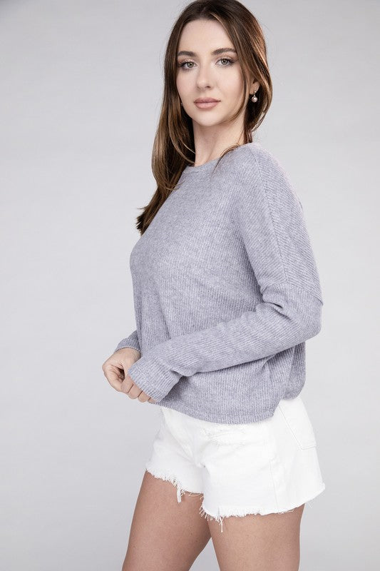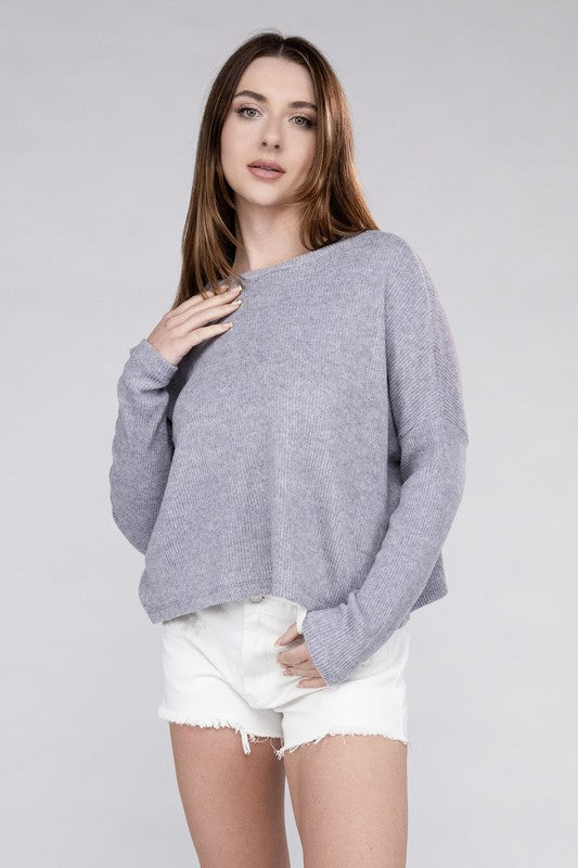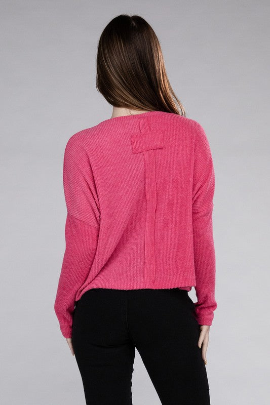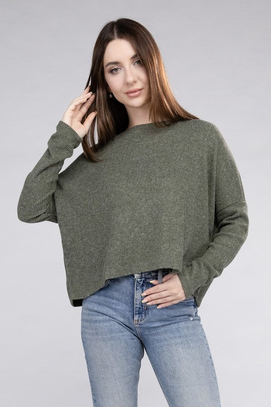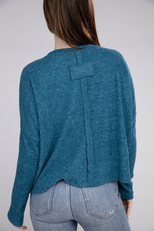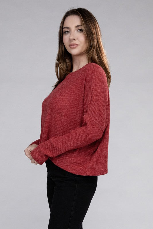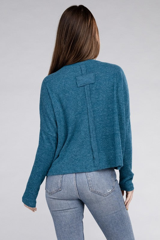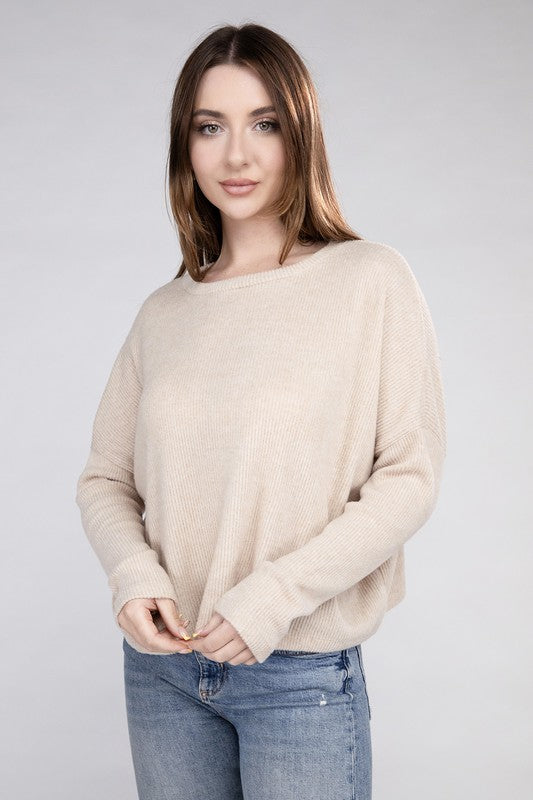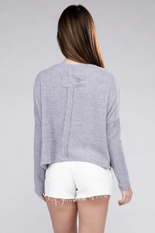 A versatile and cozy addition to your wardrobe. The ribbed texture adds a touch of dimension to the classic design, while the dolman sleeves provide a relaxed and comfortable fit. The back patch detail adds a unique element that sets this sweater apart. Whether you're looking for a stylish option for everyday wear or a comfortable choice for lounging, this sweater is a perfect choice.