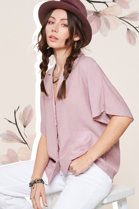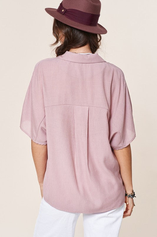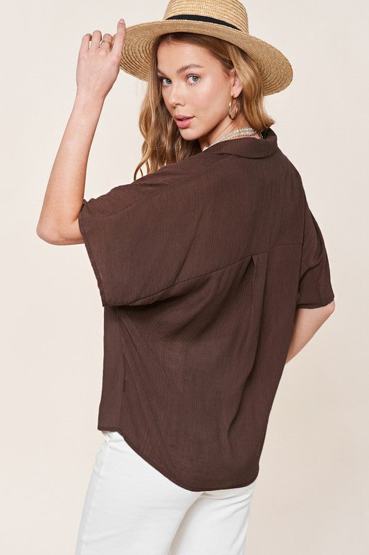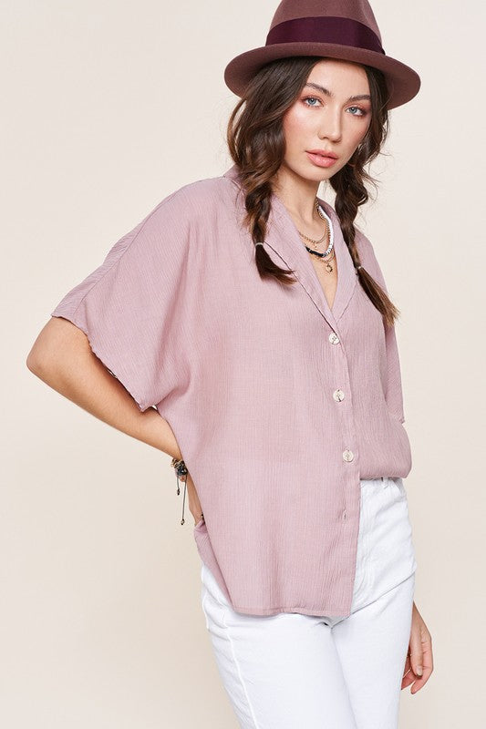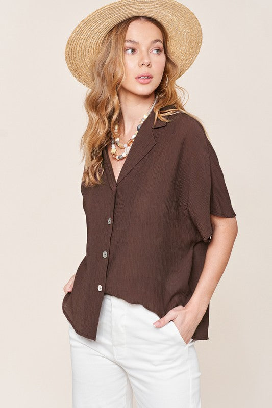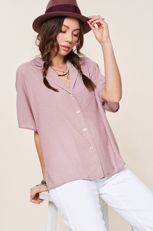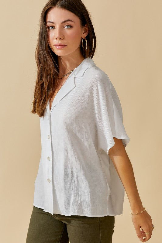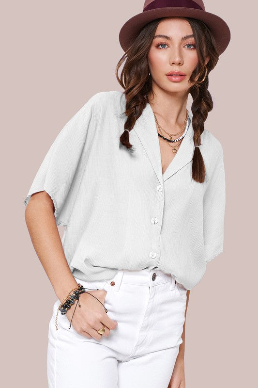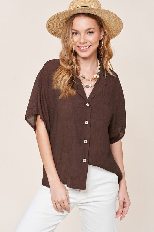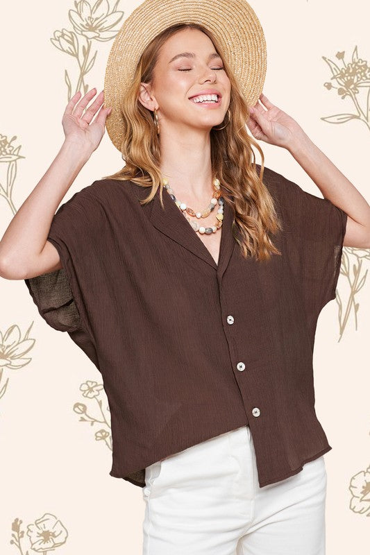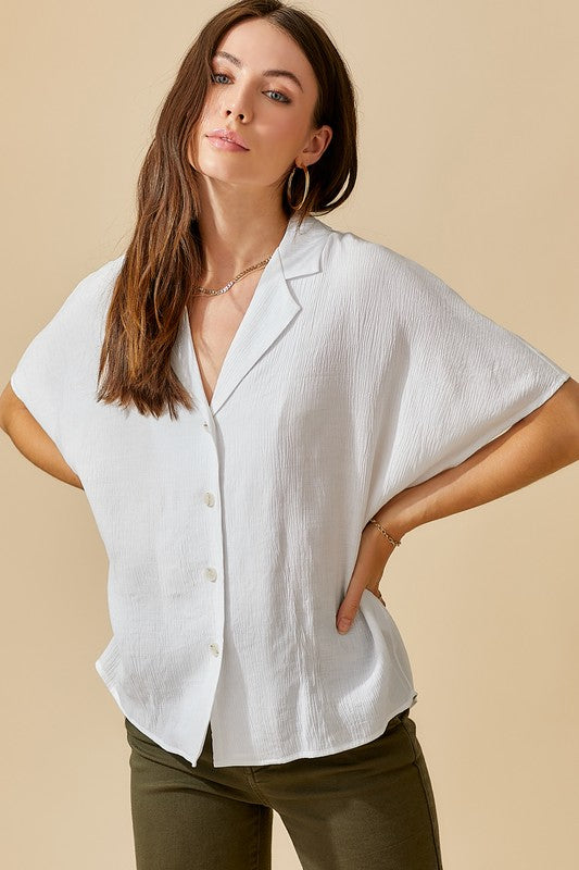 The Zoey Top is a classic button-down shirt with a modern twist. Its notch lapel adds a touch of sophistication, while the wide short sleeves give it a contemporary and relaxed feel. This combination of timeless design and contemporary elements makes the Zoey Top a versatile and stylish choice for various occasions.